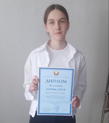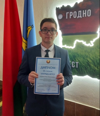 Диплом 3 степени по учебному предмету “История Беларуси в контексте всемирной истории” завоевал ученик 11 класса гимназии г. Хойники Павел Гордейчик (учитель Александра Белявская).