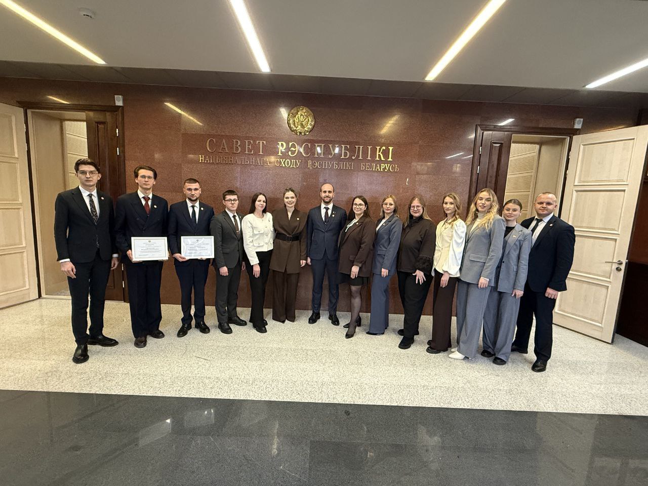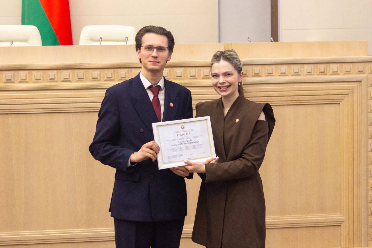 За весомый личный вклад, всестороннюю помощь и поддержку молодёжного парламентского движения, активное участие в реализации инициатив и проектов Молодёжного совета при Совете Республики Национального собрания Республики Беларусь Владимир Смольский награждён Грамотой от председателя Молодёжного Совета Алины Ретьковой